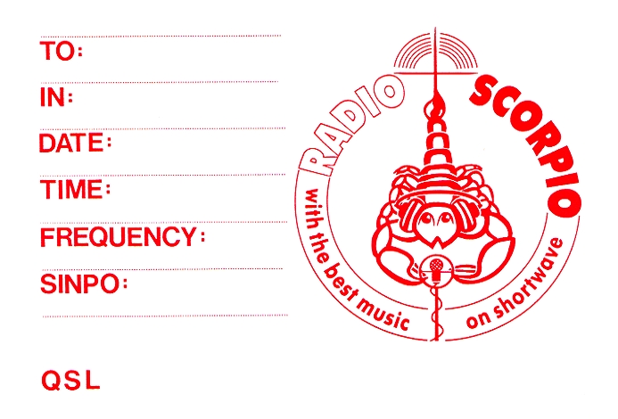 Nach dem (aus heutiger Sicht vorläufigen) Ende von Radio Sylvia erschien eine Wiederaufnahme der Sendungen mit eigenem Sender zu riskant. Am 27. März 1985 änderten wir den Sendernamen in Radio Scorpio und nahmen zwecks Anmietung von Sendezeit Kontakt zu verschiedenen ausländischen Kurzwellenpiraten auf. Die Verhandlungen mit der belgischen Station Radio Delmare, die seit Herbst 1984 mit 1,5 kW auf Kurzwelle sendete, waren erfolgreich, und so konnten wir schon bald europaweit an jedem 1. Sonntag des Monats ein vierstündiges Programm via Radio Delmare mit starkem Signal auf 6206 kHz ausstrahlen.