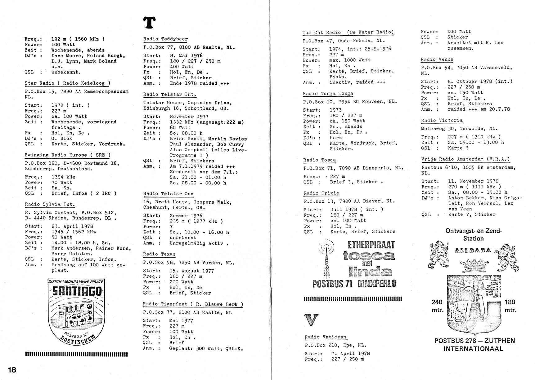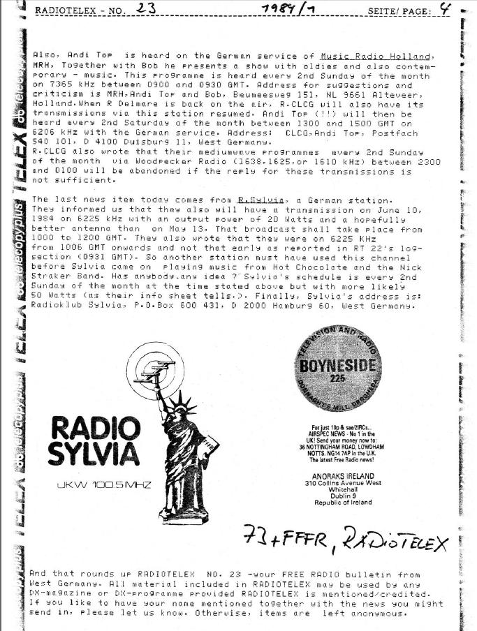 Doppelseite aus dem "Free Radio Journal" mit einem Hinweis auf Radio Sylvias Mittelwellensendungen (1979)
