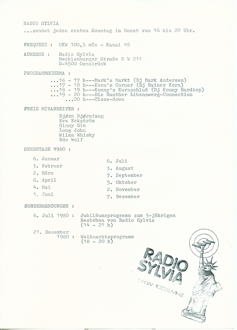 Die Mittelwellensendungen litten jedoch unter permanenten technischen Schwierigkeiten und wurden im Juni 1978 eingestellt. Unser neues Ziel war eine Wiederaufnahme der Sendungen auf UKW mit stärkerem Sender an neuen Standorten: Am 5. November 1978 startete Radio Sylvia mit regelmäßigen Sendungen auf UKW 100,5 MHz, die an jedem 1. Sonntag des Monats stattfanden und vier Stunden dauerten.