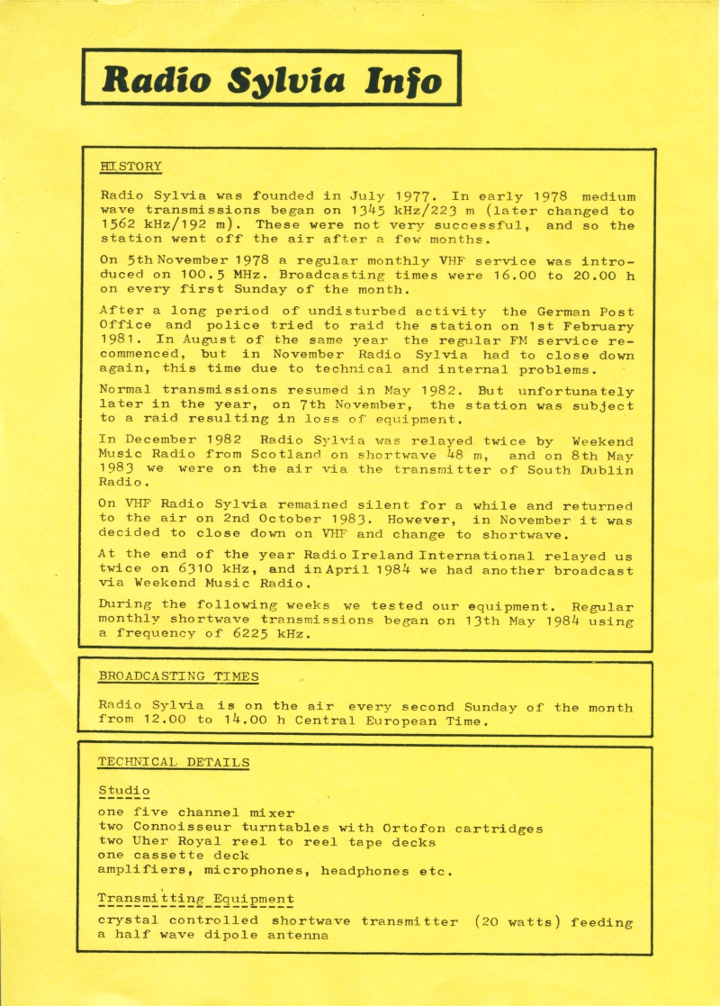 Info-Blatt mit unserer Geschichte, den Kurzwellensendezeiten und Informationen zur technischen Ausrüstung (1984)