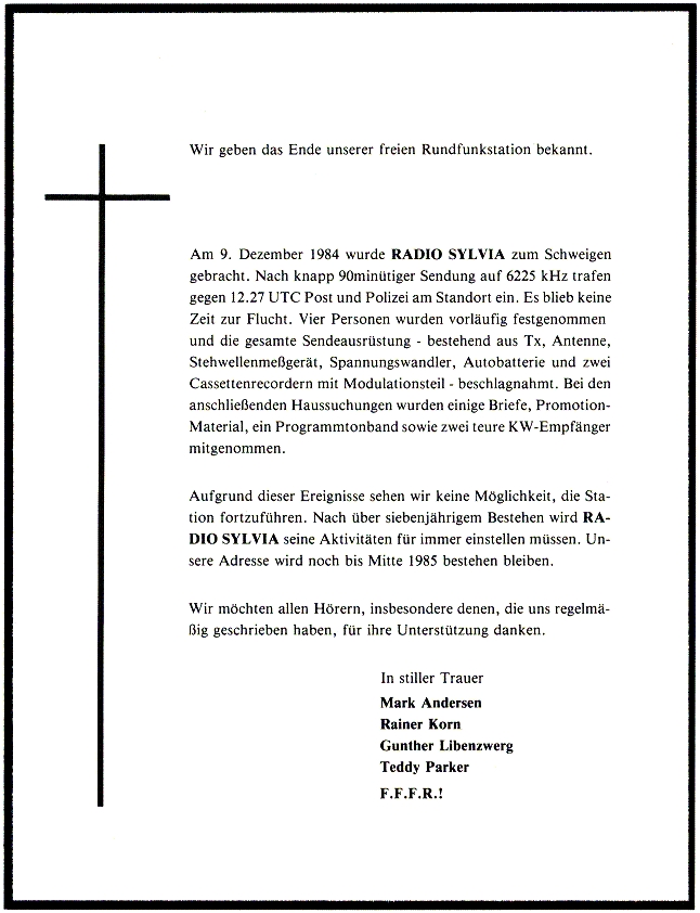 Anlässlich der Aushebung von Radio Sylvia ließen wir eine Todesanzeige drucken, die wir an unsere Hörer verschickten. Einige Monate später wurden wir zu hohen Geldstrafen verurteilt.