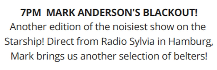 In September 2025 we started our cooperation with the British radio station Starship Overflow, which was on the air with test broadcasts in September and October. In the course of these tests, the "Blackout" with Mark Andersen was transmitted live on 6th September from 6 p.m. to 8 p.m. After the official start of the station on 12th October, the "Blackout" is now aired every Saturday from 8 a.m. to 10 a.m. and from 8 p.m. to 10 p.m. - running the current show as well as repeats of older shows.